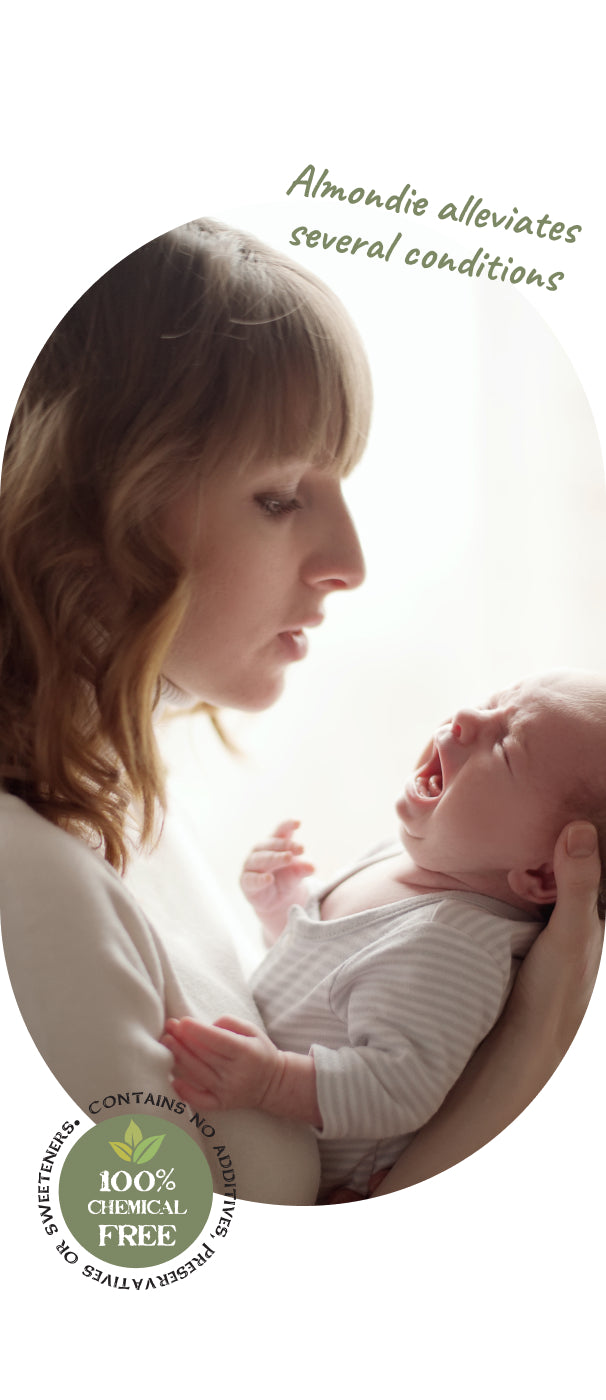 Fussy and hungry babies can benefit tremendously when Almondie is added to their bottle. Fussy babies are often suffering from constipation, gas, or other discomfort relating to digestion. Almondie acts as a natural antacid and settles their stomach, calming the child and alleviating their discomfort.