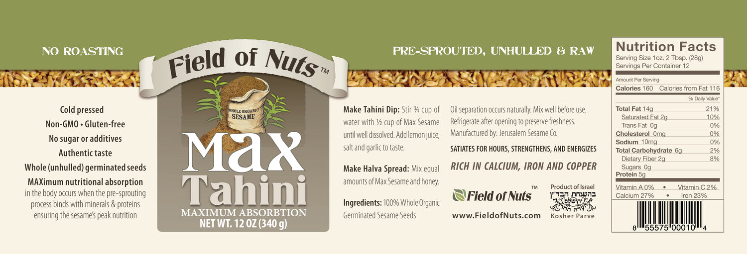 Enjoy MAX Sesame Tahini made from fresh, raw, pre-sprouted, unhulled sesame seeds. The sesame seeds are cleaned in cold water and then go through a patented grinding machine that uses a cold process without roasting. When you eat a tablespoon of MAX Sesame Tahini, within seconds an abundance of nutrients will absorb into your bloodstream giving you energy, leading to increased strength and vitality.