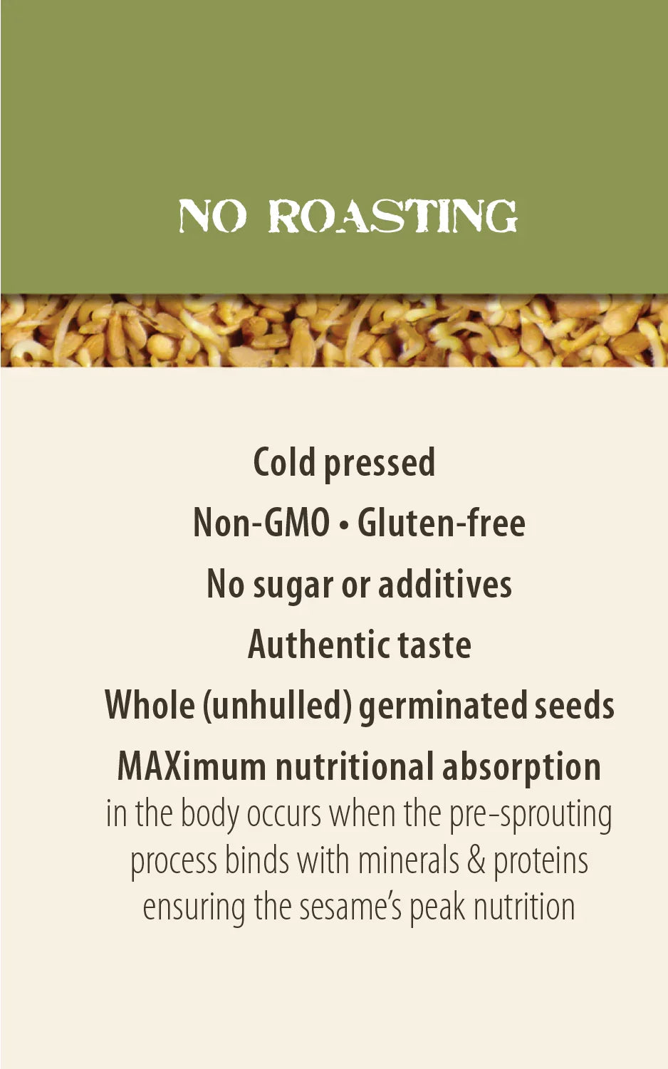 During the pre-sprouted stage the calcium, iron, zinc*, magnesium, and other minerals in the sesame seeds bind with the proteins. The binding of the protein and the minerals causes the vitamins and minerals to be more easily and effectively absorbed by the body than any other tahini on the market!