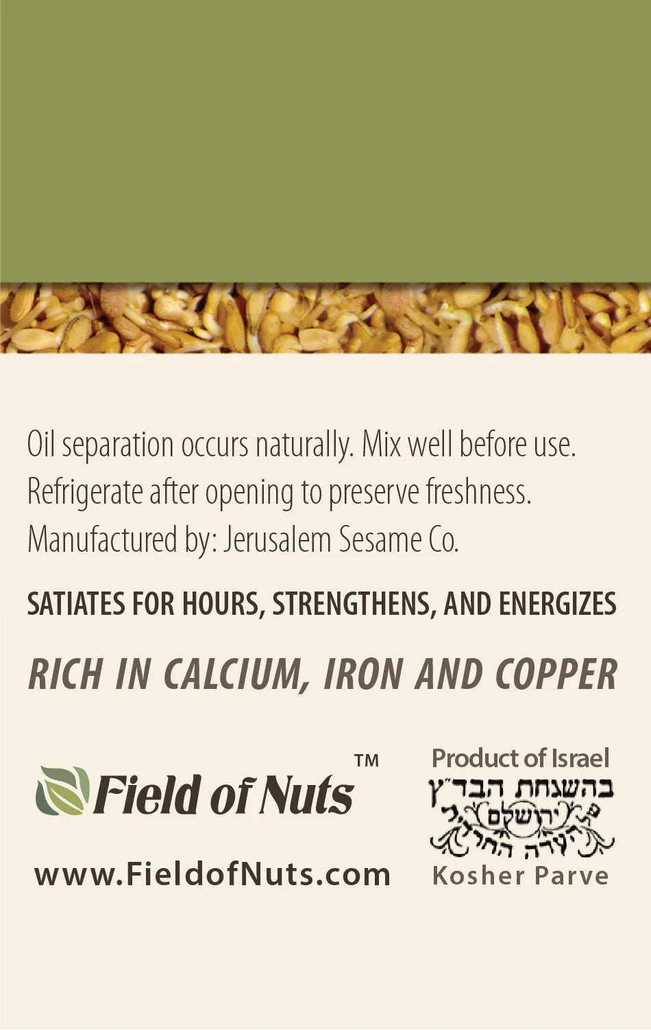 Our MAX Sesame Tahini is 100% raw and packed with nutrition. Its delicious, authentic taste and rich texture is all natural - it contains no salt or additives. Field of Nuts MAX Sesame Tahini is certified kosher, vegan, gluten-free, non-GMO, and dairy-free. Our MAX Sesame Tahini is Paleo, Keto and Whole30 approved and manufactured in a peanut-free facility.